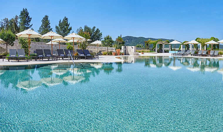 Chambres : Les 7 chambres deluxe Grand (48 m²) et les 119 suites junior (53 m²) impressionnent par des matériaux exquis et de haute qualité combinés avec des accents intemporels de la culture régionale. Confortablement meublées, toutes disposent d’une salle de bain, douche pluie séparée, peignoir, sèche-cheveux, TV satellite, téléphone WiFi (gratuit), cafetière/théière, minibar, coffre-fort, climatisation, grand balcon ou terrasse. Les Garden suites junior ont un accès direct au jardin, tandis que les Valley et Resort Suites se trouvent aux étages supérieurs et font face à la direction correspondante.