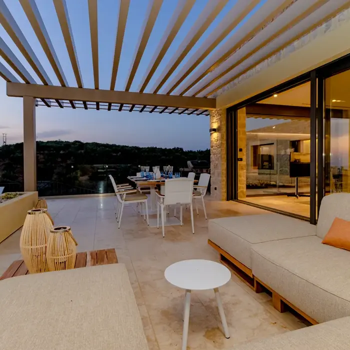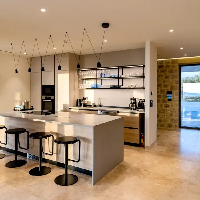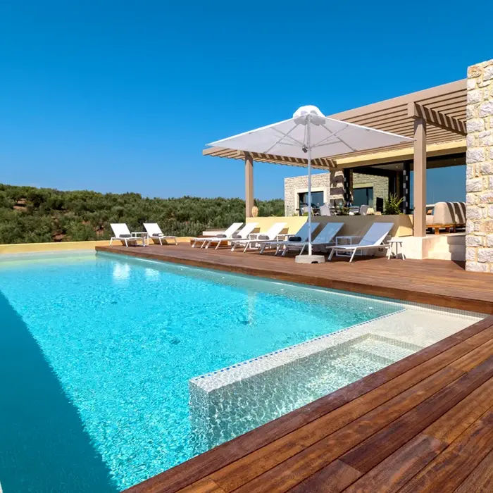 Villa Ruby (Beispiel): Die Villa liegt auf der Spitze eines Hügels über der Bucht von Navarino und bietet einen atemberaubenden Blick auf das Ionische Meer und die Lagune von Gialova, jenseits des eigenen Infinity-Pools. Diese erstaunliche Residenz befindet sich auf 2 Ebenen inmitten eines Olivenhains, und die Sandstrände, Restaurants und erstklassigen Golfplätze der Gegend sind alle nur eine kurze Autofahrt entfernt.