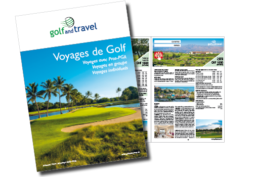 L’éventail de nos différents types de voyages ne laisse pratiquement rien à désirer. Vous souhaitez ne vous occuper de rien pendant vos vacances de golf ? Nos semaines de divertissement et de tournois en compagnie d’un guide bilingue Golf & Travel sont extrêmement populaires et nous amènent vers de nombreuses destinations de golf variées. Au cours de nos semaines de stages avec des professionnels de la PGA Suisse, vous apprendrez soit à jouer au golf en partant de zéro où vous perfectionnerez votre niveau de golf individuel en y travaillant chaque aspect de votre jeu. Catalogues
